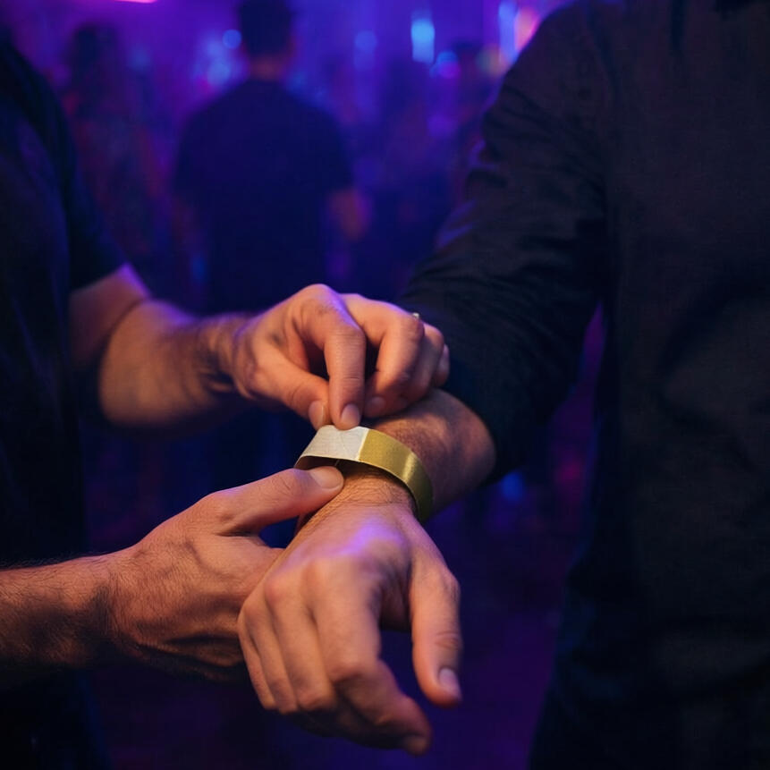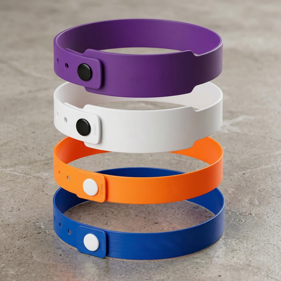 Pulseiras resistentes ao tempo com fechamento em pinos invioláveis, fabricadas em material durável e impermeável.